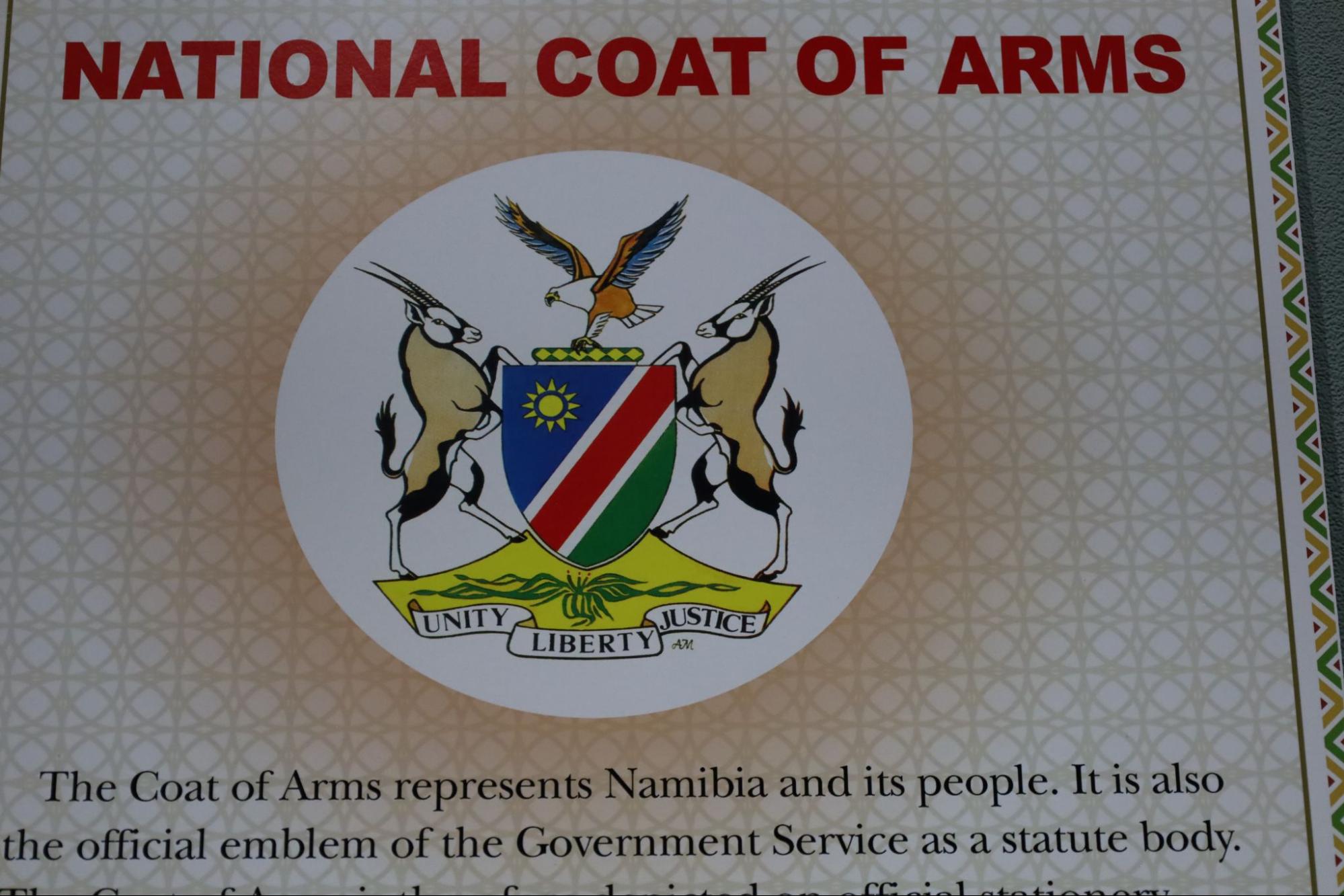 Герб Намибии: орлан-крикун, ориксы и вельвичия